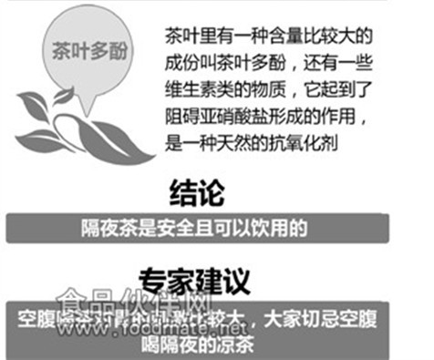 隔夜茶是安全且可以飲用的已經得到證實,而針對怎樣喝茶比較健康,專家建議道:“空腹喝茶對胃的刺激比較大,大家切忌空腹喝隔夜的涼茶。稍微加點溫水或者溫茶水兌一下,對人體還是有好處的�!保▉碓�;人民網食品健康頻道)